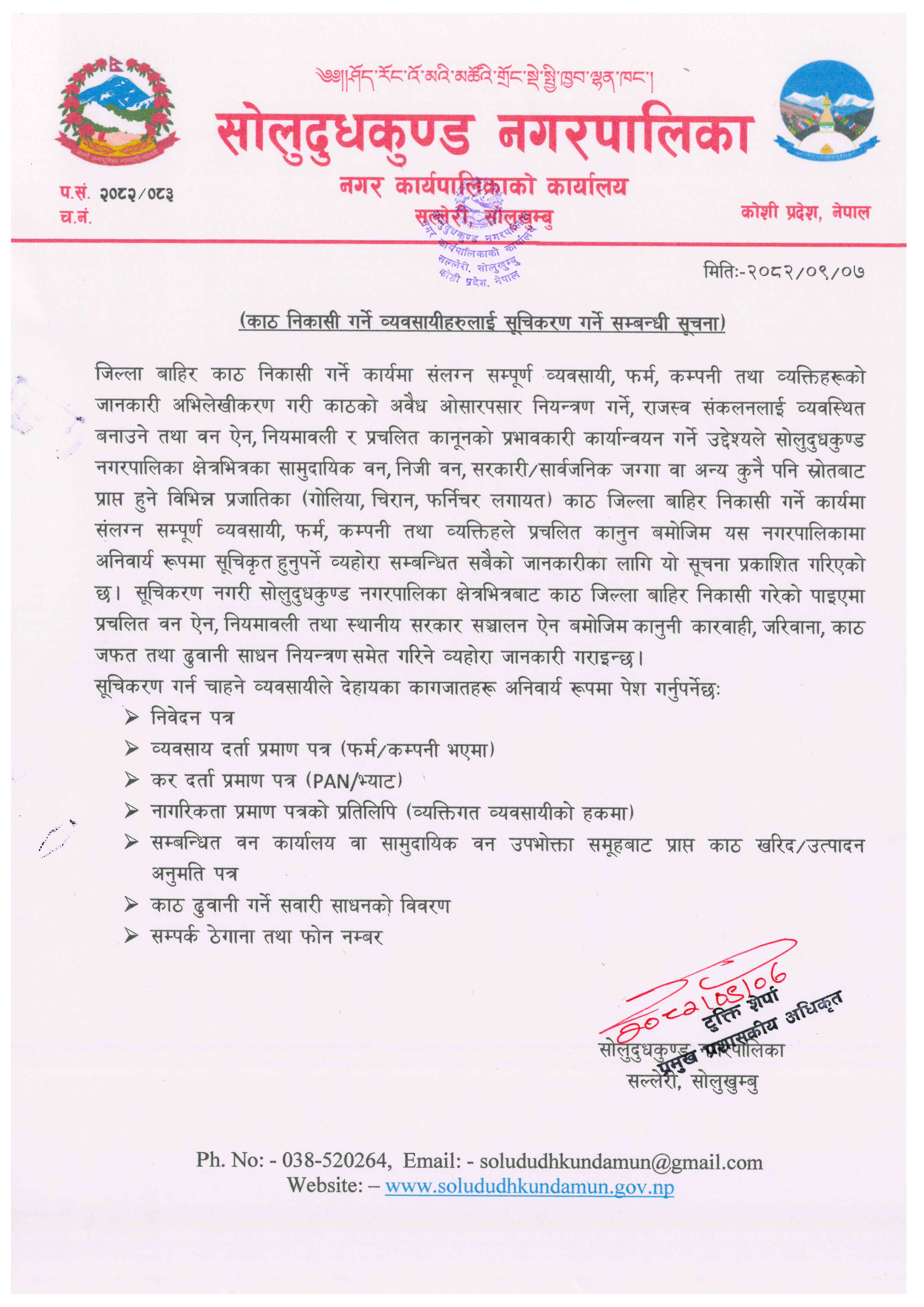 » काठ निकासी गर्ने व्यवसायीहरुलाई सूचिकरण गर्ने सम्बन्धी सूचना ।