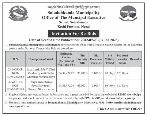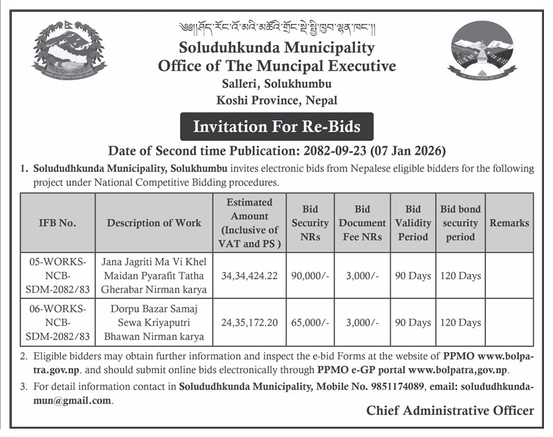 जनजागृति माध्यमिक विद्यालयको खेलमैदान प्याराफिट तथा घेराबार र दोर्पु बजार समाज सेवा कृयापुत्री भवन निर्माण कार्यका लागि बोलपत्र आह्वान सम्बन्धी सूचना