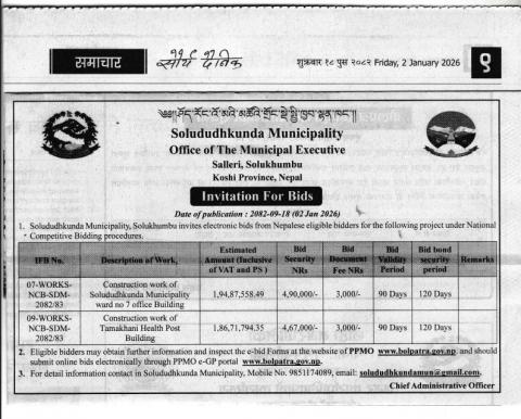» सोलुदुधकुण्ड नगरपालिका वडा नं. ७ को भवन तथा तामाखानी स्वास्थ्य चौकी भवन निर्माण कार्यका लागि बोलपत्र आह्वान सम्बन्धी सूचना