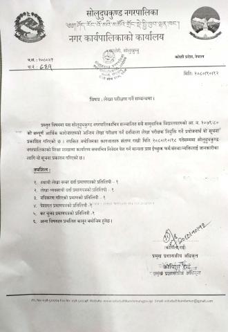 सोलुदुधकुण्ड नगरपालिका अन्तर्गत सञ्चालित सबै सामुदायिक विद्यालयहरुको शैक्षिक वर्ष २०७९/८० को लेखापरिक्षण गर्ने सम्बन्धि सूचना।